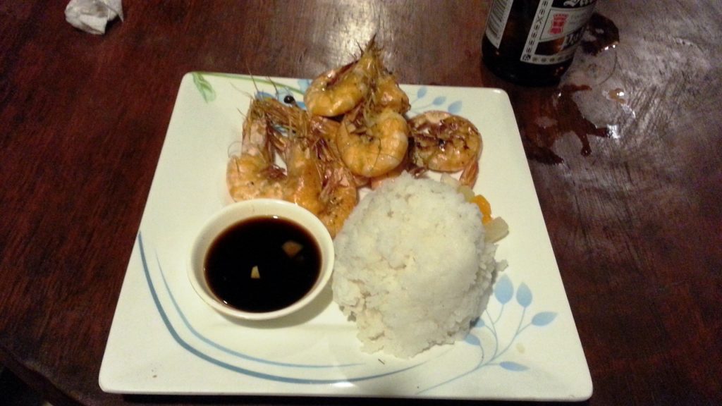 One night I went up to the Bacuit Grill (at the north eastern end of the El Nido Town beach next to El Nido Corner). They have several meal options for about PHP180. However, they had 5 prawn dishes on the menu at PHP100. I ordered Thai Prawns (which come with rice). The waitress took my order but returned 5 minutes later to say that they had no prawns. She suggested that I have a shrimp dish instead. All of the shrimp dishes were PHP250… I decided to continue my search somewhere else. Please Note: Some Restaurants seem to confuse ‘shrimp’ with ‘prawn’… sometimes the ‘shrimps’ are the bigger ones (what we call ‘prawns’).