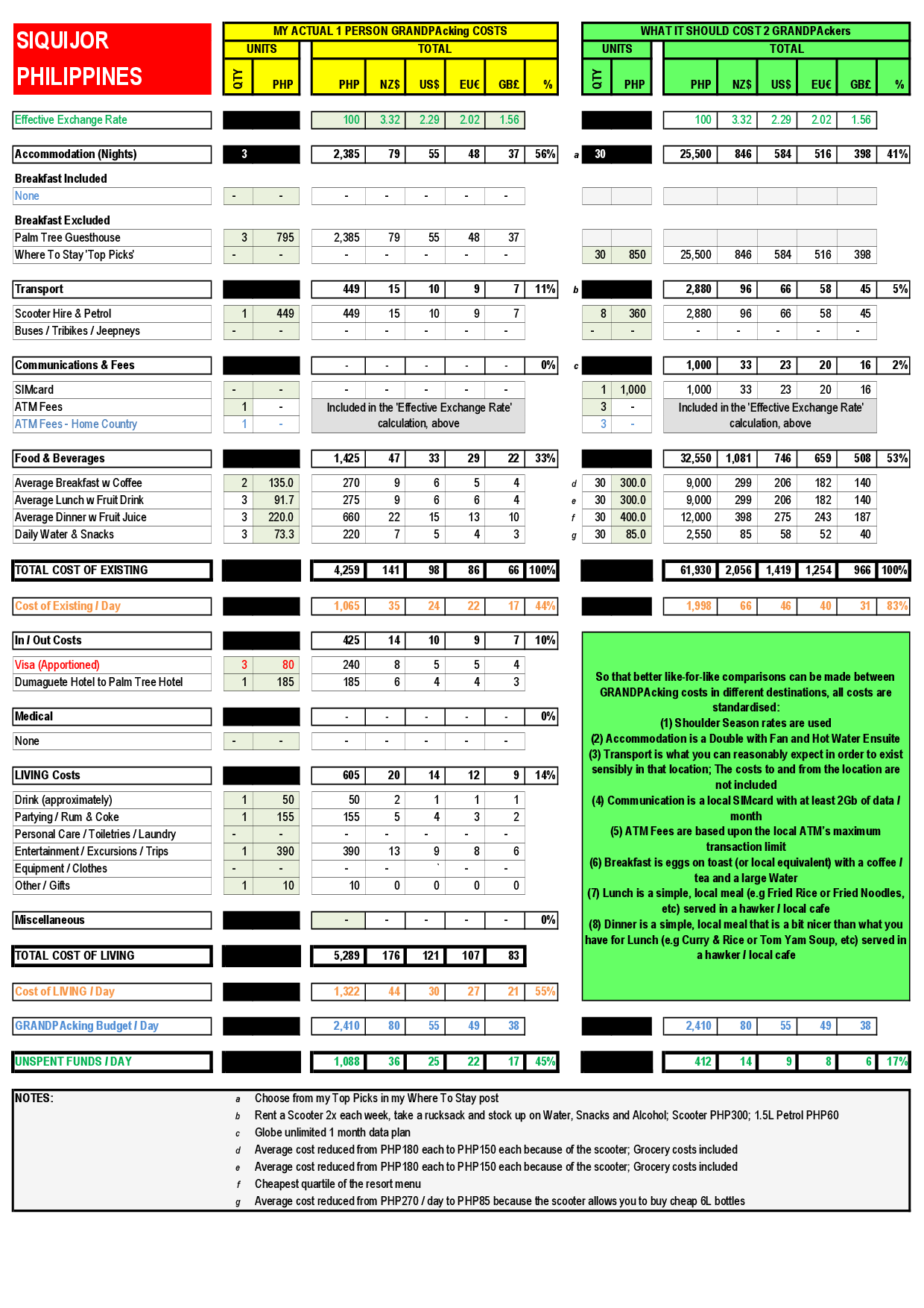 The ‘Cost Of Existence’ of 2 GRANDPAckers is about PHP1988 / NZ$66 / US$46 / €40 / £31 per day.