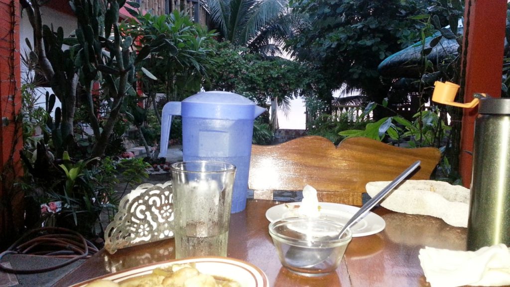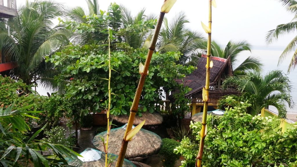 We left port at 1:25pm. The heavens opened up and it ‘persisted down’. He dropped me off at the gate to my resort at 2:05pm. It was still pouring. I took shelter under trees for a while … I ended up huddling in some poor locals front porch!