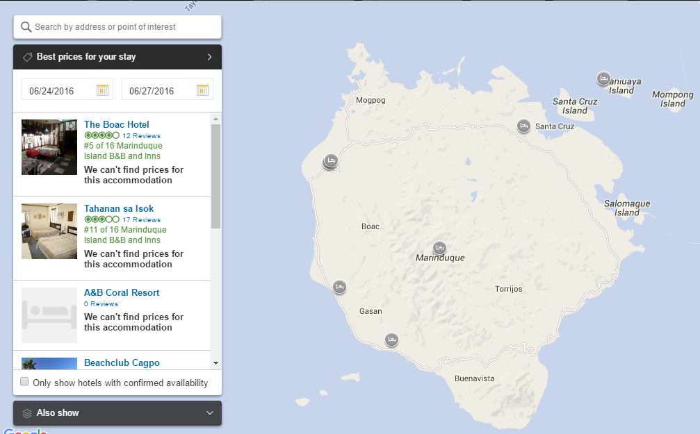 In fact, there is very little information online about accommodation in Marinduque, full stop … and very few hotels listed in the search engines with prices. Agoda and TravelBook have no hotels listed … Tripadvisor shows 7 hotels but no prices: