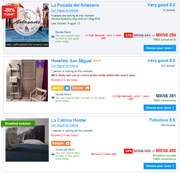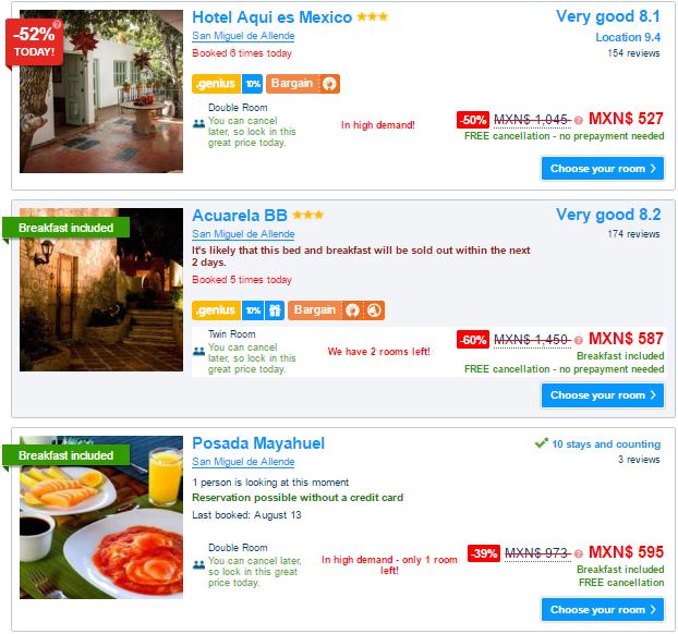 In the, above, example the ‘Hotellito San Miguel’ comes with a private bathroom. This is the only one in the ‘cheapest 9’ that does for under MXP500 / night … and, that’s only because of the 52% discount on the rack rate.