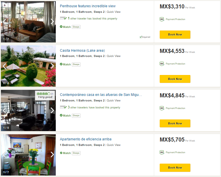 The cheapest Rental, above, is the “Penthouse’ which works out to be MXP473 / night. This is the ONLY Rental within GRANDPAcking price range. When I looked at its availability in August, it was already fully booked from November 2017 through to March 2018.
