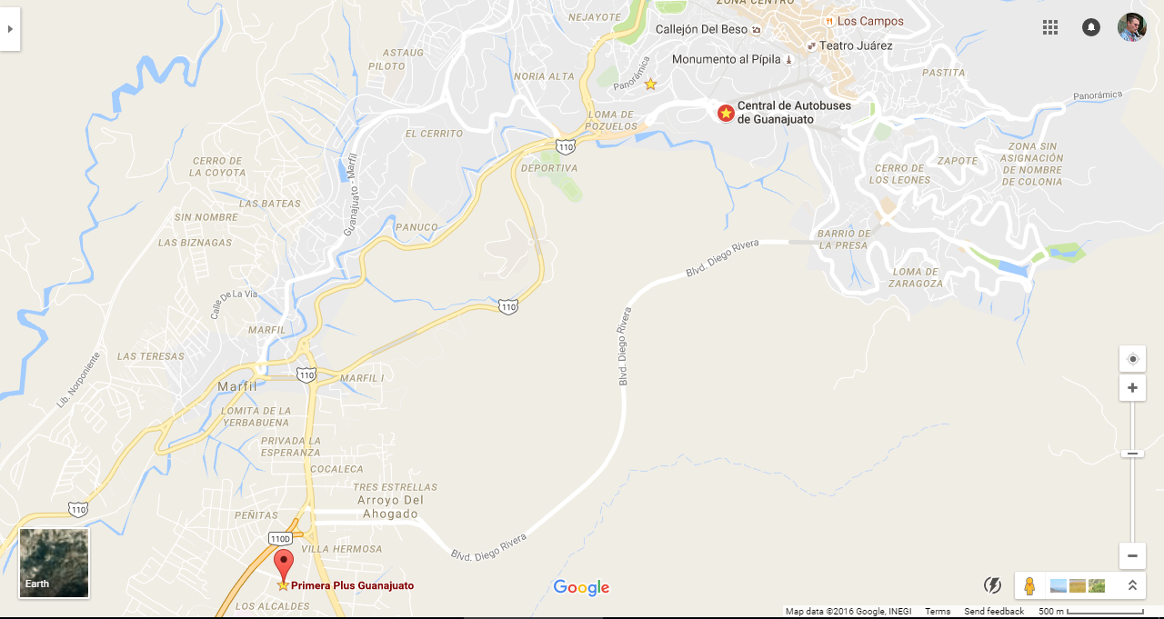 The correct location is 7kms out of centre where Primera Plus is shown. This is the same station that I arrived at when I came to Guanajuato from Ajijic.