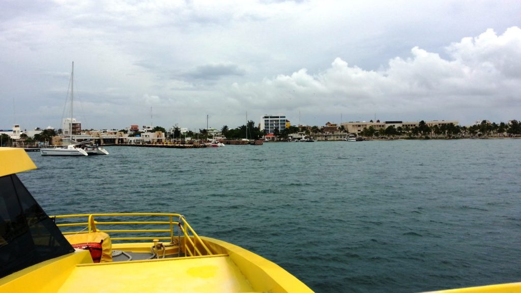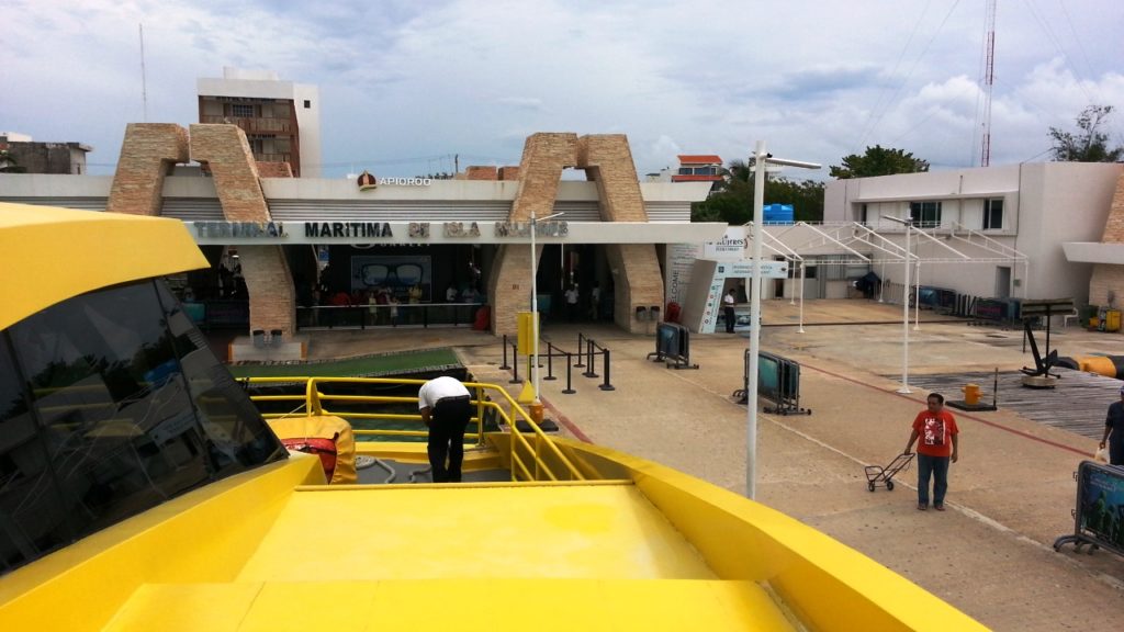 I was informed by the receptionist at the Mundo Maya that the ferry to Isla Mujeres left from Puerto Juarez and that a taxi should cost me MXP35-40. It was about 3kms from the hostel.