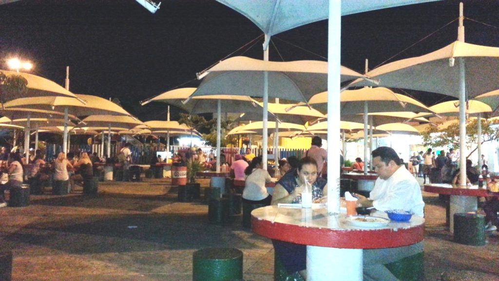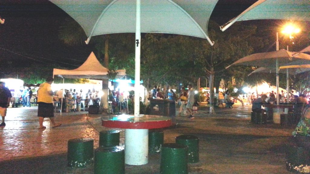However, just 1 block from the Mundo Maya is the Jardin Del Arte. This is a park where the locals meet. On Sundays there is music and Salsa dancing. Around the park are food stalls. On one side there are permanent eateries set up which sell Tacos for as little as MXP5 each. There are a wide selection of meals to be had for MXP25-50.