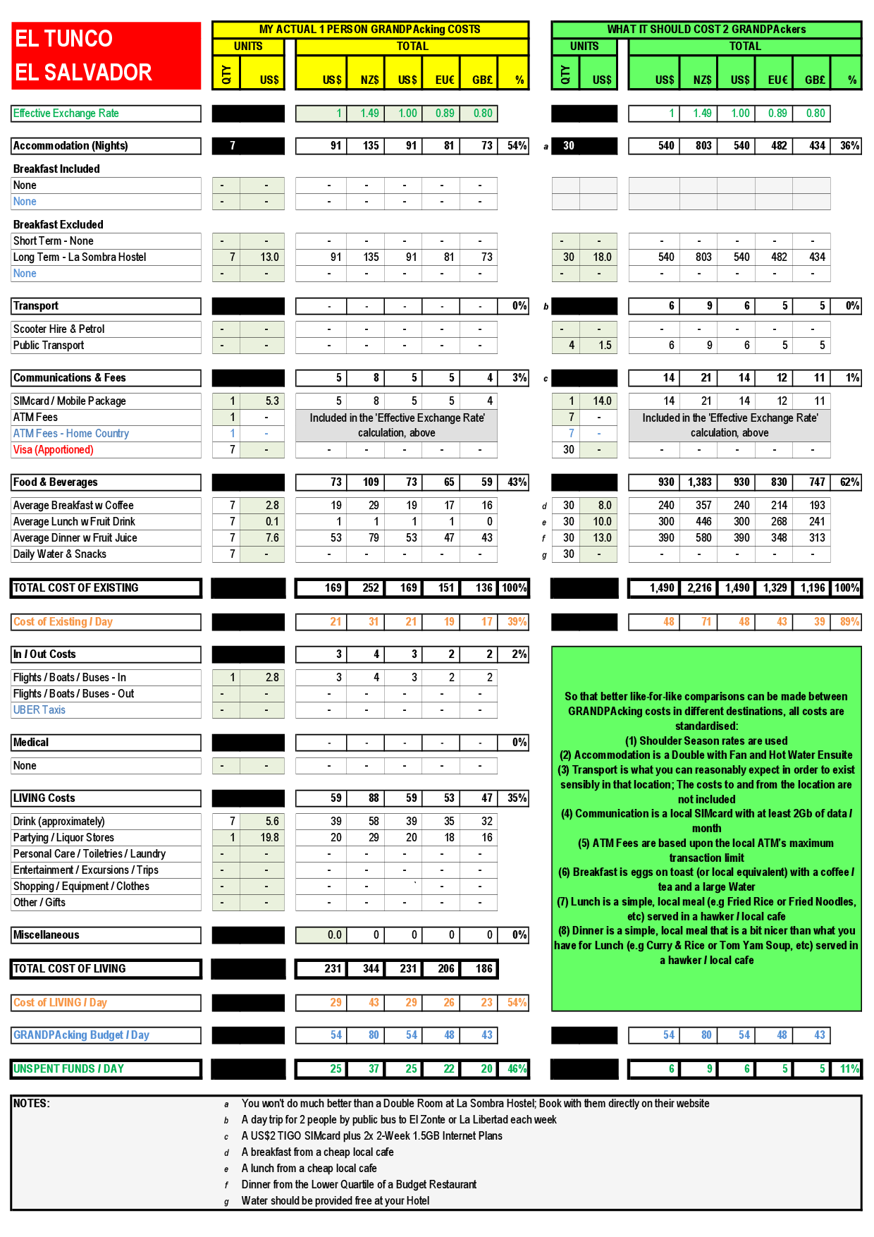 This post contains a detailed breakdown of costs for 2 GRANDPAckers holidaying in El Tunco, El Salvador to GRANDPAcking standard.