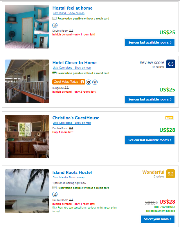 In Roatan, a search of Google Maps and Facebook pages helped me find a monthly rental … the same is true for Big Corn. I found a link to Corn Island Rentals (CIR). One place was listed for as little as US$280 / month. I emailed all of those listed for under US$600 / month (but still looked decent) to enquire about availability.