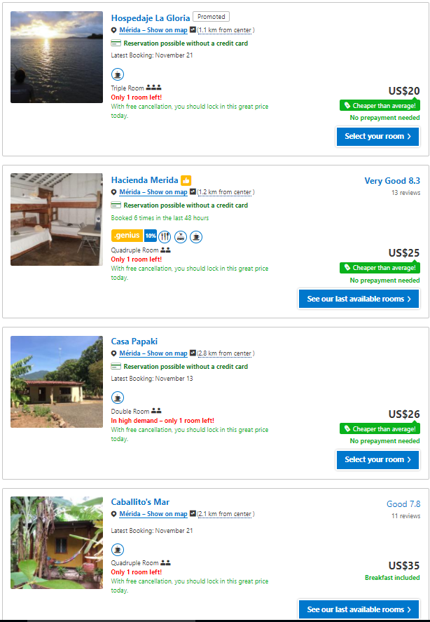 Accommodation-wise, this is typical of what you find online around the island … this is for 1 night in the middle of December 2017 (the first month of their High Season) …