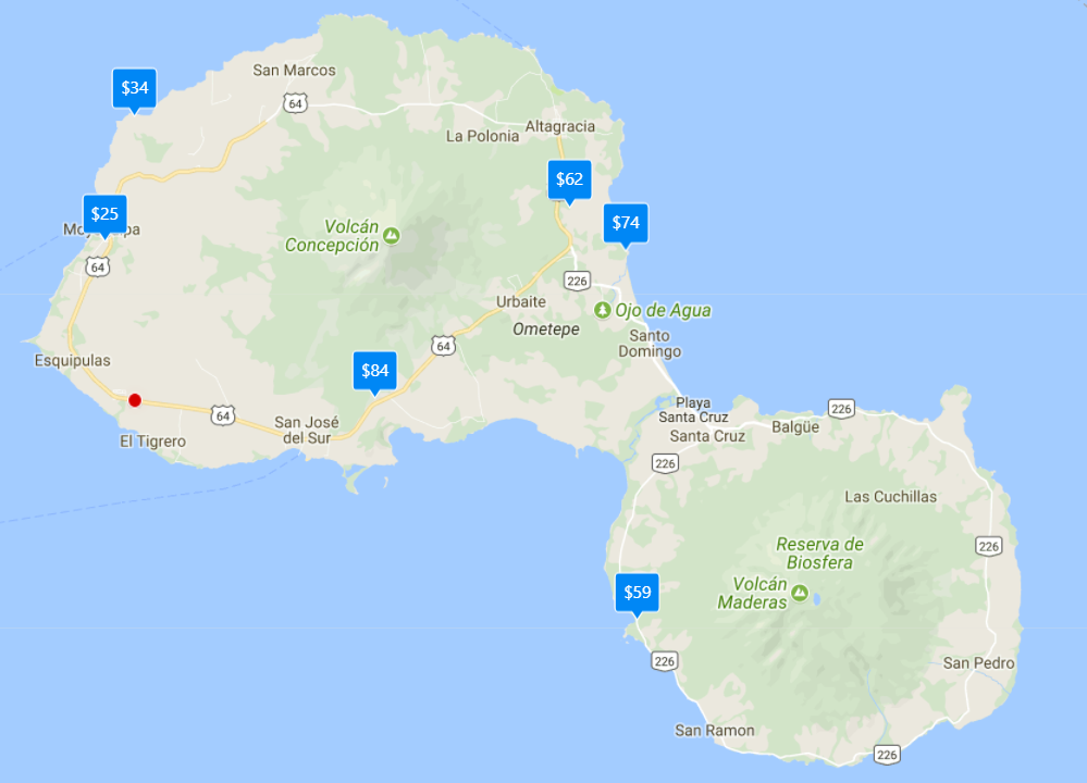 In / Out Costs: It cost me US$10.35 / N$310 to get from my Granada hotel to my Ometepe hotel. This covered a taxi in Granada (N$30 for 2 people), a Chicken Bus to Rivas (N$70 including luggage), a Chicken Bus to San Jorge (N$10), the ferry to Ometepe (N$50), and the Colectivo to the Tecali (N$150).