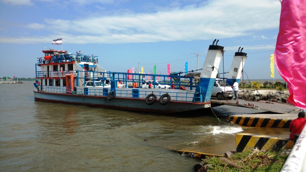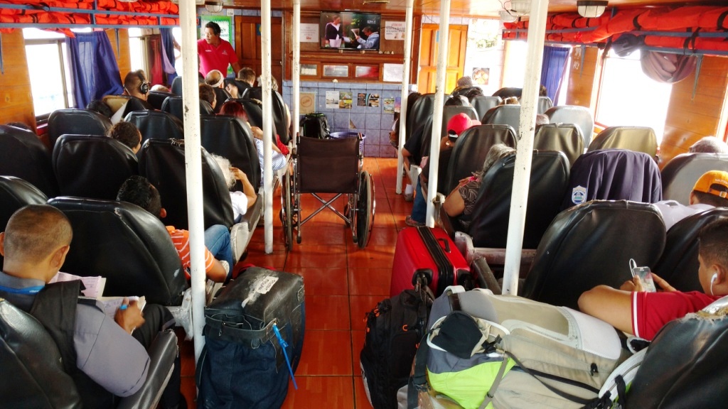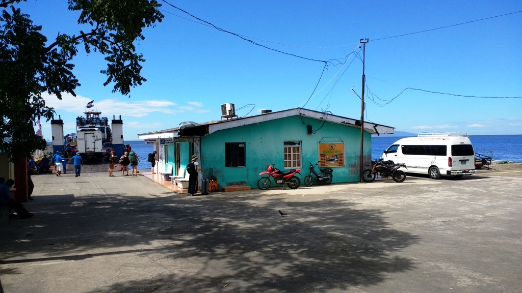 We were approached immediately by an official looking tout. He asked us if we needed transport from Moyogalpa to our hotel … which we did. We were going to the other side of the island: Santa Cruz. There were 4 of us. He offered a price of US$30 for all 4. Within 1 minute, we had negotiated him down to US$5 each. We paid him and took it on trust that there would be a Colectivo waiting for us in Moyogalpa; he gave us a ticket for the booked Colectivo. We, then, bought our ferry tickets (N$50 each) and boarded the ferry.
