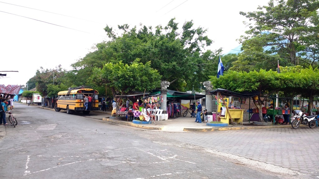 A bus to San Jorge (the port where you catch the ferry to Ometepe Island) was waiting. We jumped on. Our bags were thrown into the luggage compartment. The bus weaved its way through busy market streets (missing the market stalls by centimeters) before hitting the road to San Jorge. We arrived at the ferry port at 10:10am (N$10 each).