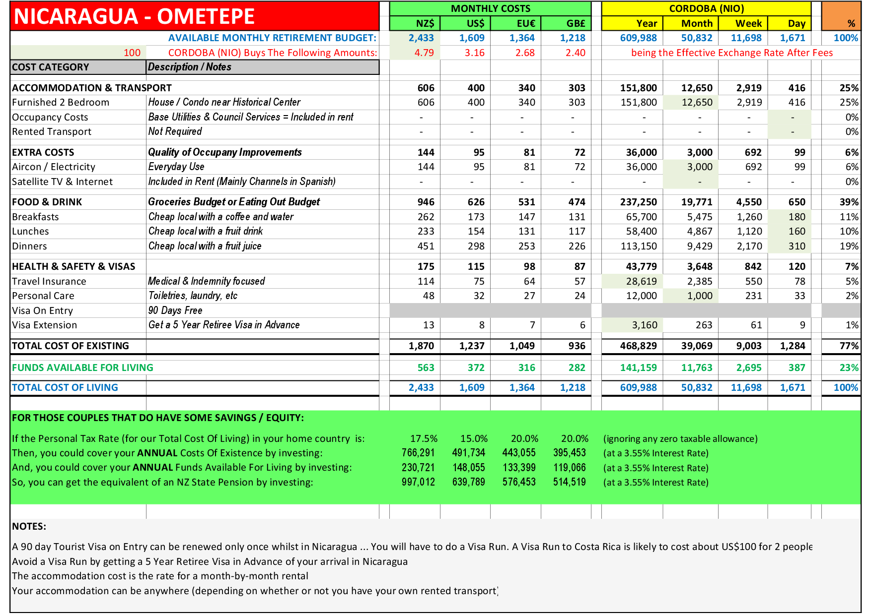 Health & Safety & Visas: Travel Insurance is from someone like World Nomads. The Visa costs are for a 5 Year Retiree Visa apportioned over that period… if you don’t have a Retiree Visa, you will need to do a Visa Run to Costa Rica every 3 months (budget US$100 per couple for each Visa Run).