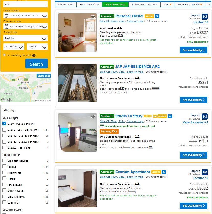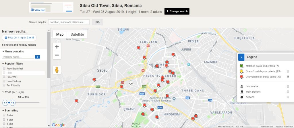 PLEASE NOTE: HOTELS usually display prices INCLUSIVE of TAXES. But many search sites (like HOTELS) don’t provide a ‘private bathroom’ filter, so be careful with some of the cheap hotels and make sure that you read the room details. HOTELS does not do well in the Romanian marketplace.