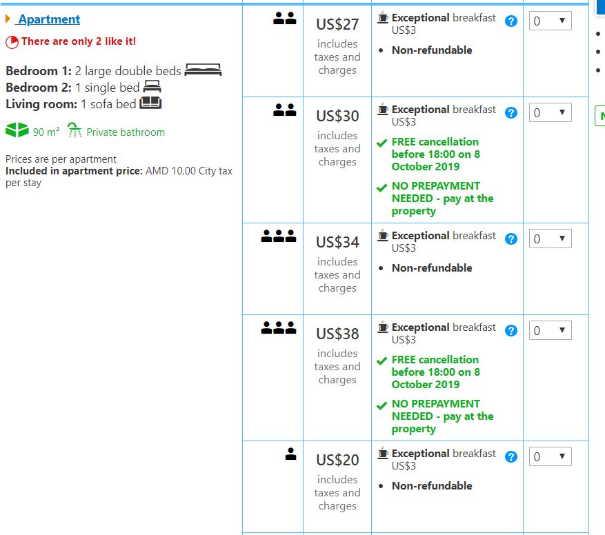 PLEASE NOTE: HOTELS usually display prices INCLUSIVE of TAXES. But many search sites (like HOTELS) don’t provide a ‘private bathroom’ filter, so be careful with some of the cheap hotels and make sure that you read the room details. HOTELS does not do well in the Armenian marketplace.