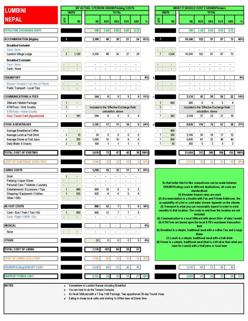 Lumbini is not really an Holiday Destination so, I have only provided a 7 day budget for comparative purposes.