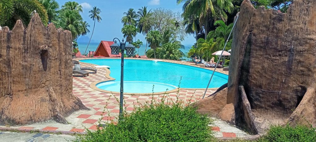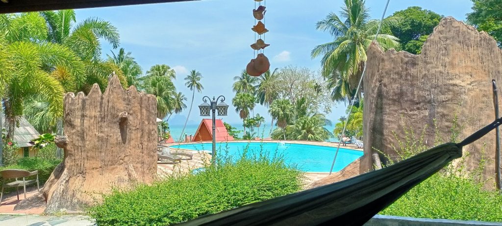 The Resort was full that night … but they moved me the next morning to a Villa nearer to the internet router. I had a strong 5mb/s internet signal and a proper view of the pool … up went my travel hammock!